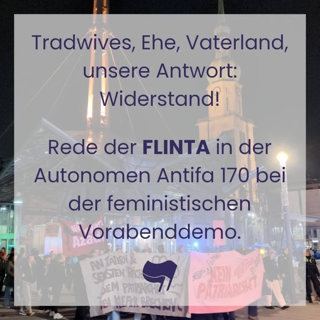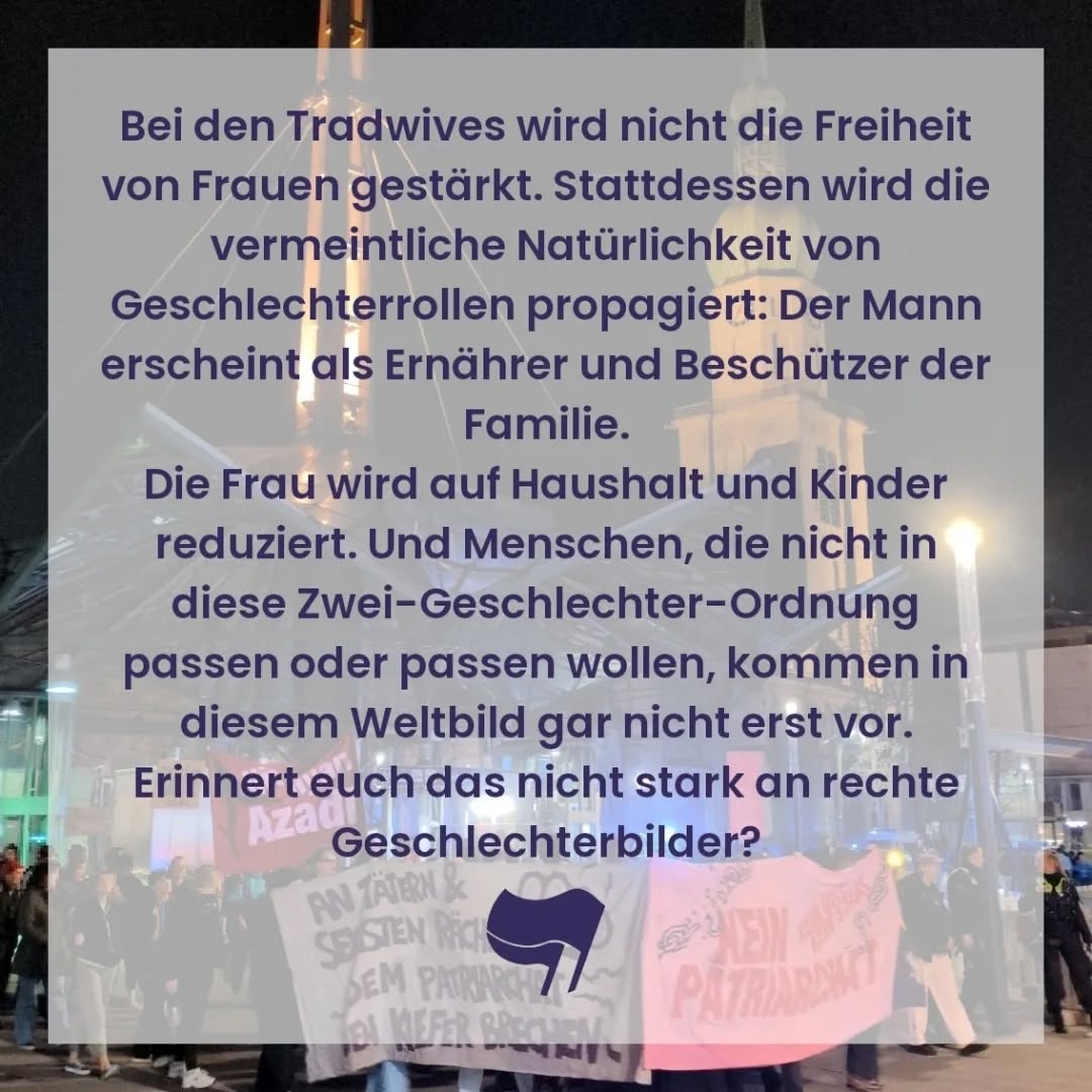 Wir haben letzte Woche bei der feministischen Vorabenddemo von @speakout.dortmund einen Redebeiträge zum Thema Tradwives gehalten. Den ganzen Text findet ihr unter aa170.noblogs.org