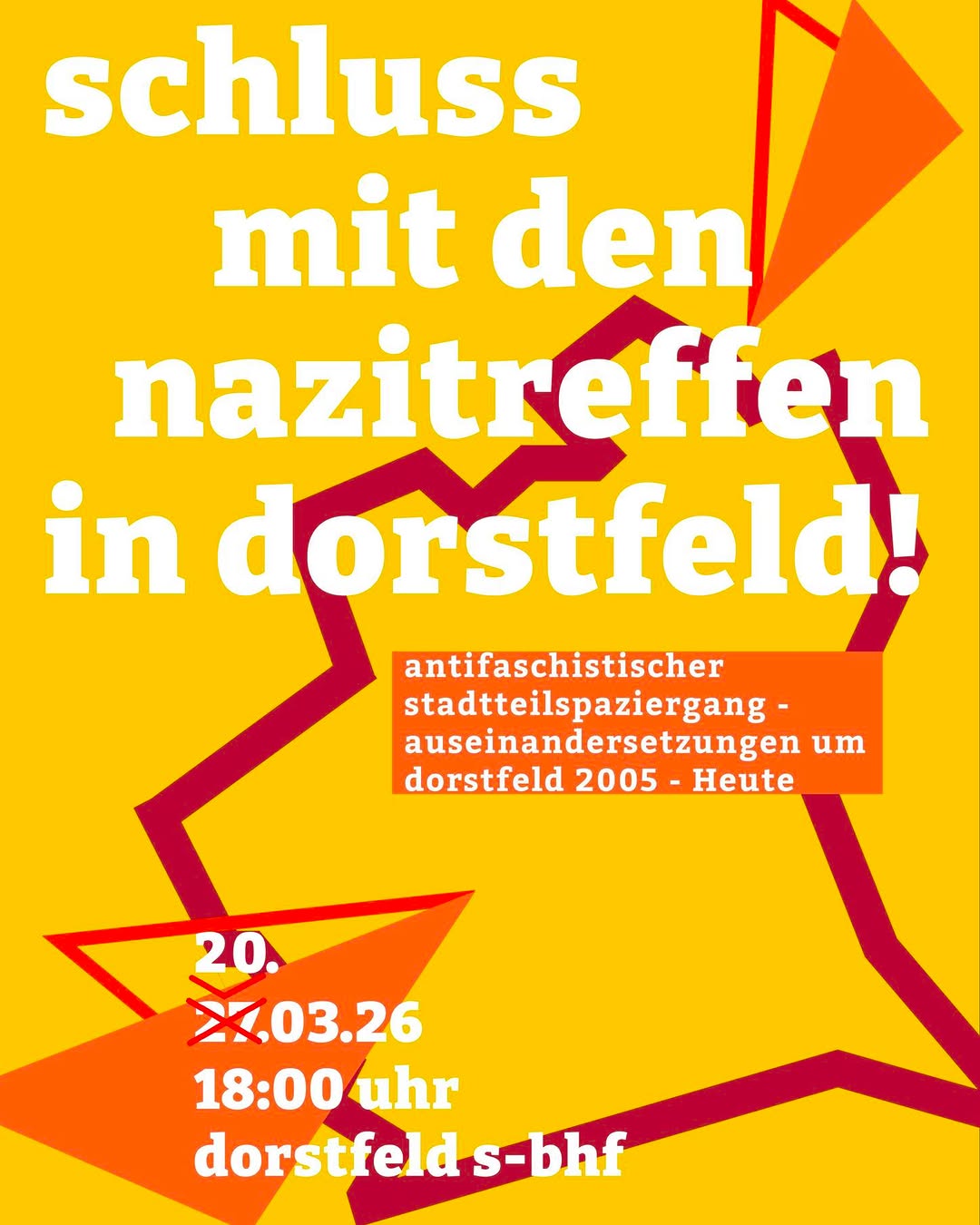 Die Proteste 2026 unter dem Motto „Schluss mit den Nazitreffen in Dorstfeld“ gegen die Offenen Abende der Splitterpartei ‚Heimat Dortmund‘ gehen in die 3. Runde. In diesem Monat organisiert die AA170 den Protest als antifaschistischen Stadtteilspaziergang durch Dorstfeld. Wir werden die Entwicklungen der Dortmunder Naziszene in Dorstfeld näher in den Blick nehmen und Orte und Geschichten der Gegenwehr kennenlernen.